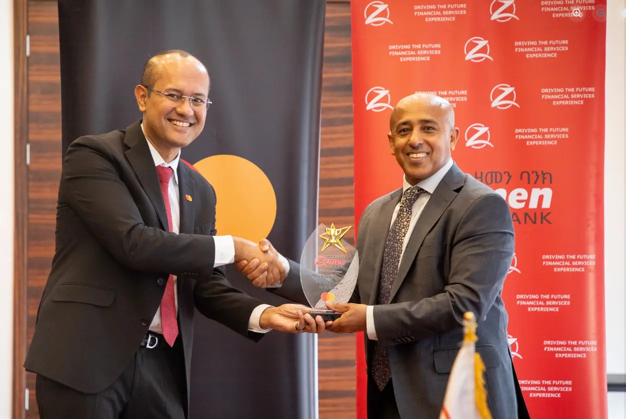 Mr. Shehryar Ali, Vice President and Country Manager of East Africa and Indian Ocean Islands at MasterCard, handed over the award to Ato Dereje Zebene, CEO of Zemen Bank, today, April 9, 2026.